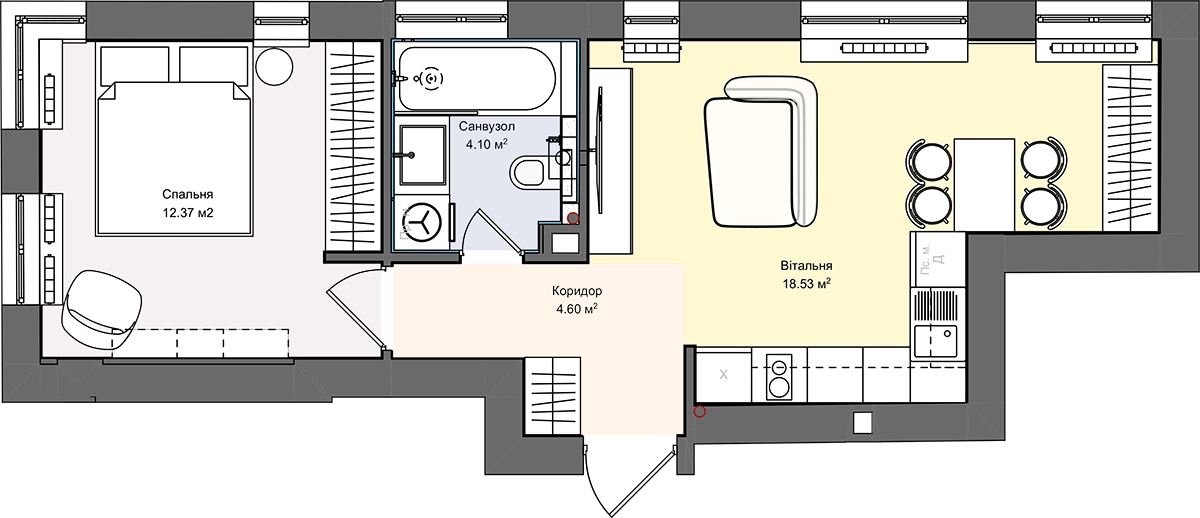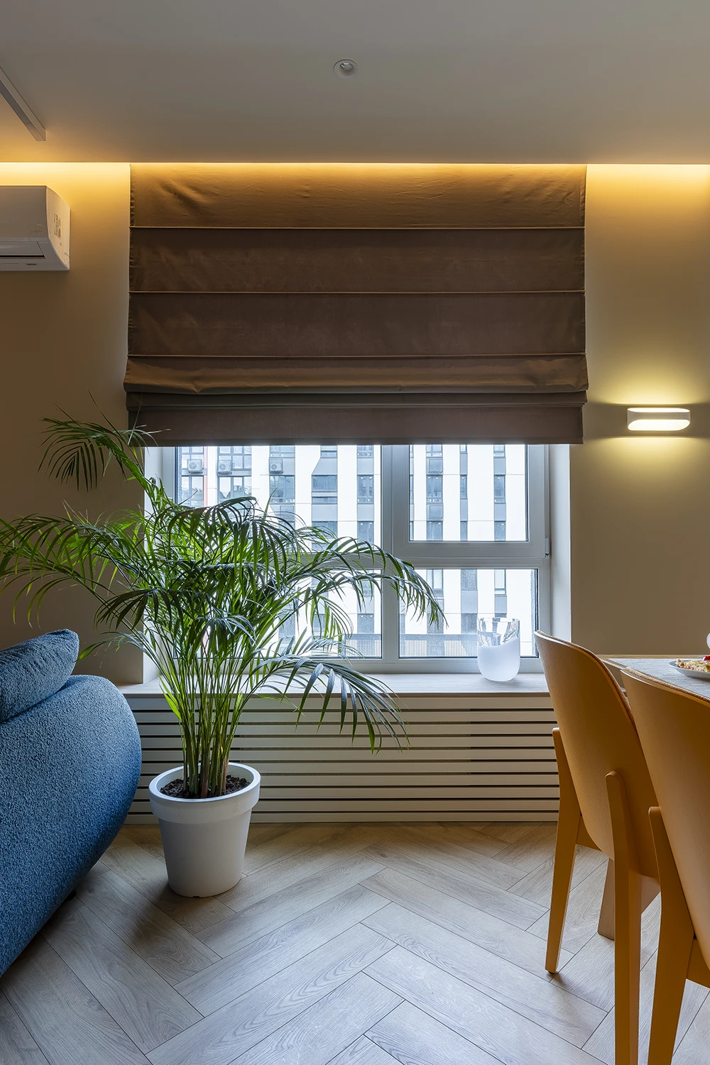 Цей проєкт створено для талановитої молодої дівчини, яка цінує комфорт, стиль та функціональність. Загальна площа квартири – лише 39,5 кв.м., але завдяки продуманному дизайну тут гармонійно поєдналися спальня, кухня-вітальня та ванна кімната.