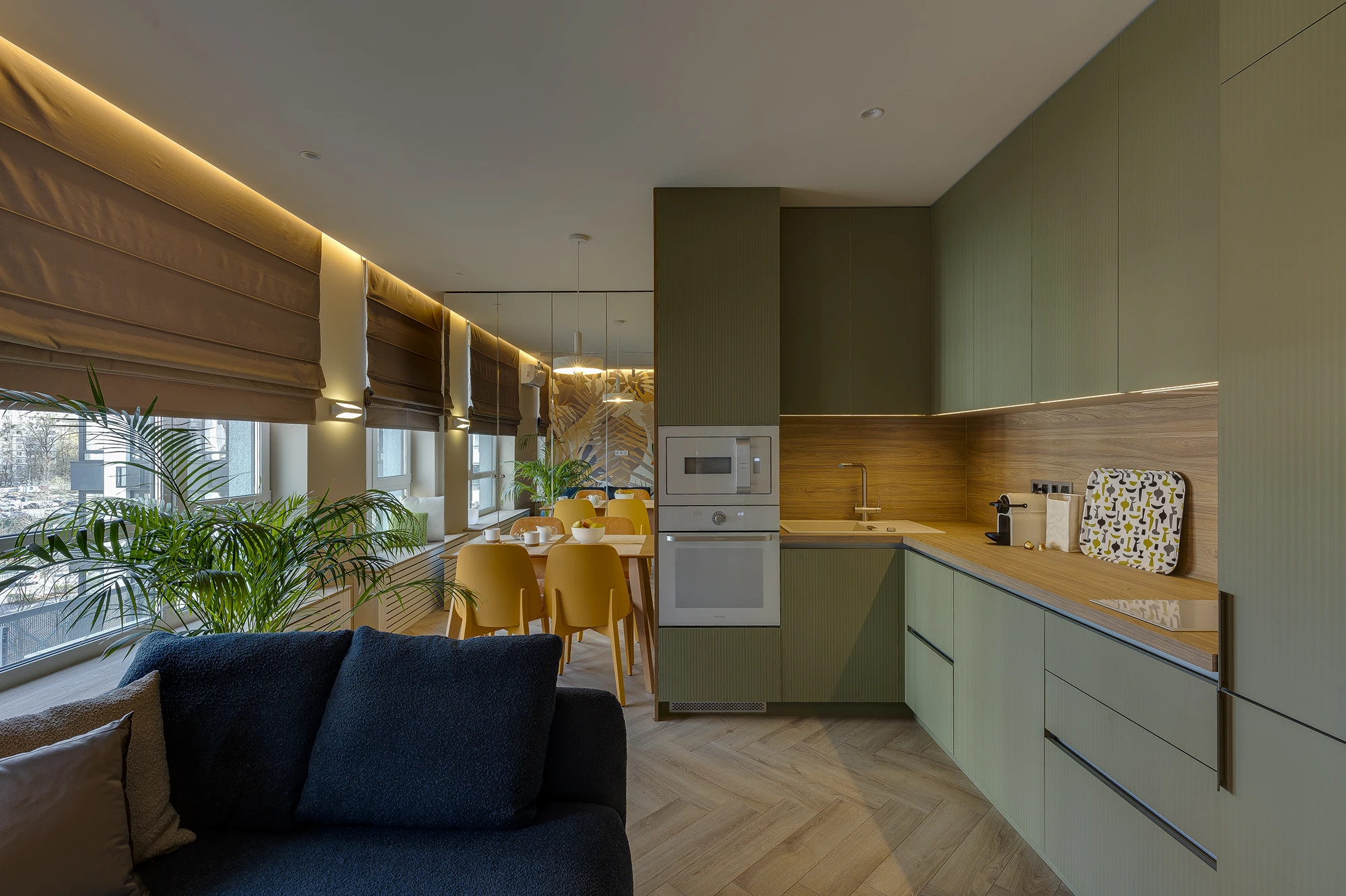 ▼Головний акцент інтер’єру – тропічні шпалери у зоні кухні-вітальні. Вони створюють сонячну, радісну атмосферу, надаючи простору екзотичного шарму. Зелені акценти та теплі тони довкола доповнюють інтер’єр природністю та гармонією.