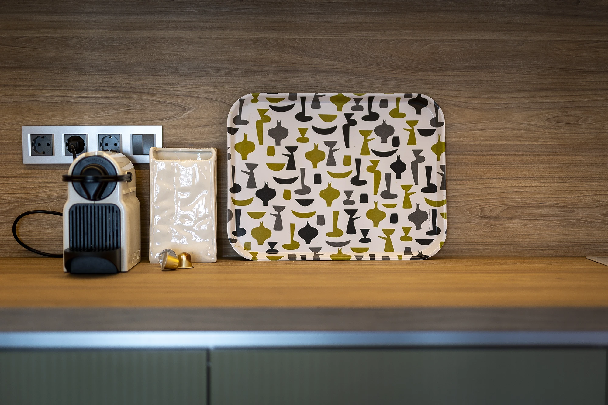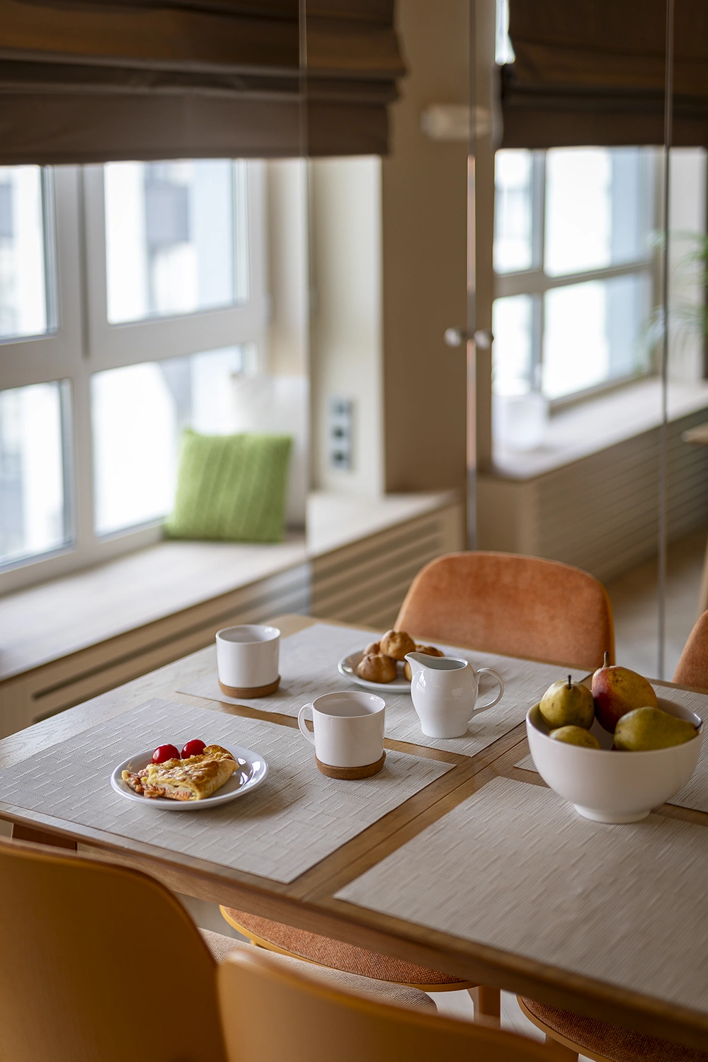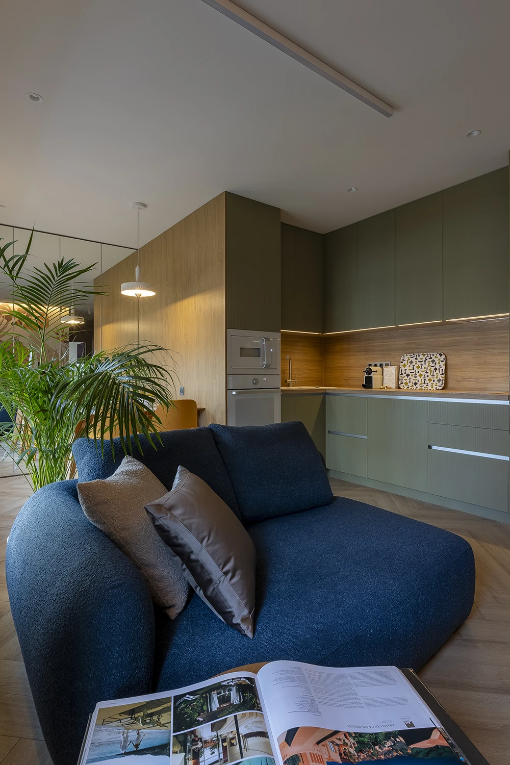 Кухня-вітальня об’єднує обідню зону для чотирьох осіб і зону відпочинку зі зручним диваном. Простора кухня оснащена всім необхідним для приготування їжі, а зони зберігання забезпечують практичність.