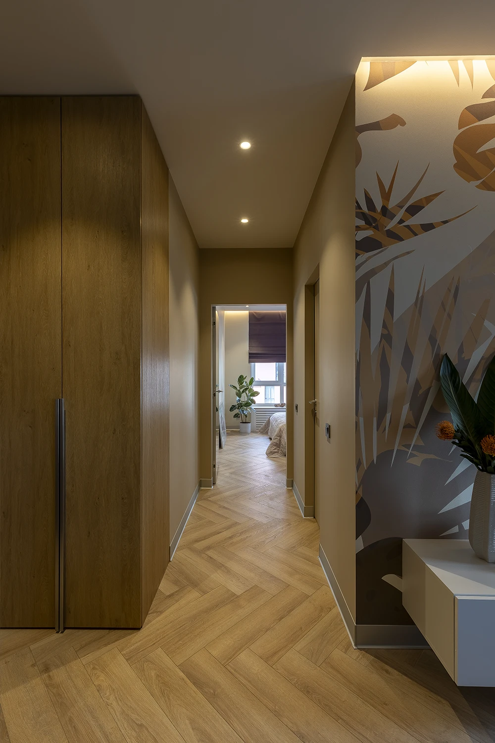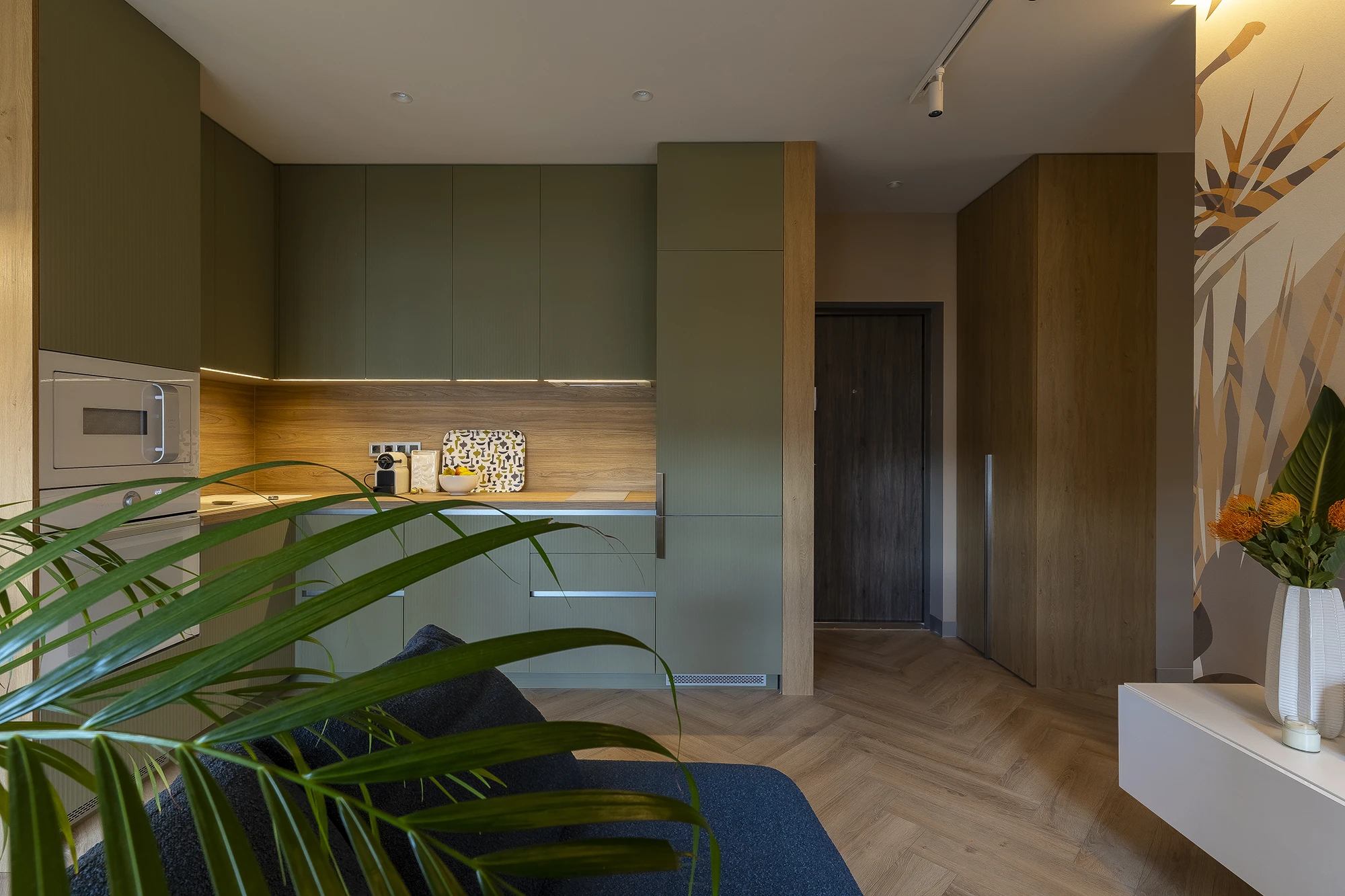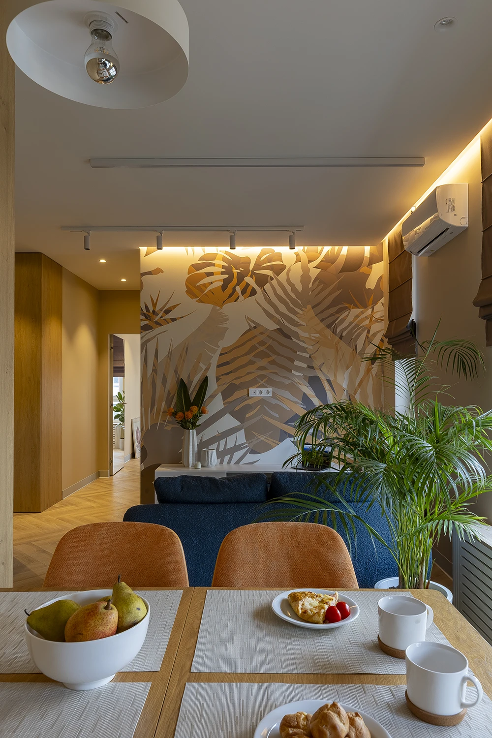 Головний акцент інтер’єру – тропічні шпалери у зоні кухні-вітальні. Вони створюють сонячну, радісну атмосферу, надаючи простору екзотичного шарму. Зелені акценти та теплі тони довкола доповнюють інтер’єр природністю та гармонією.