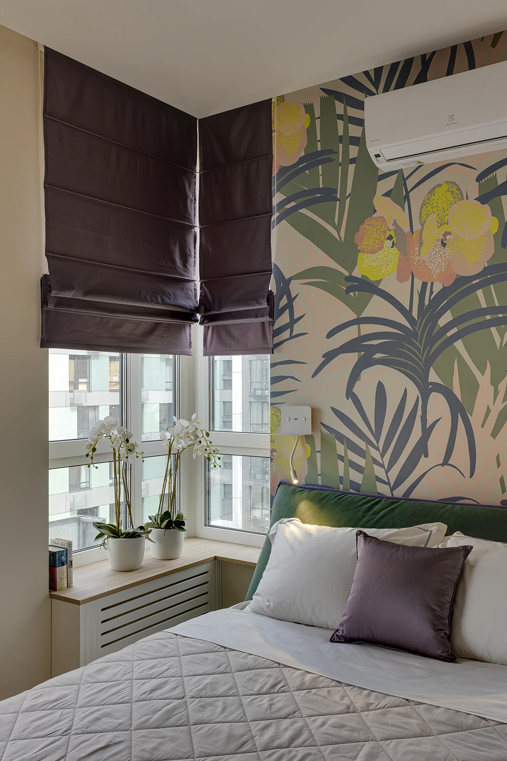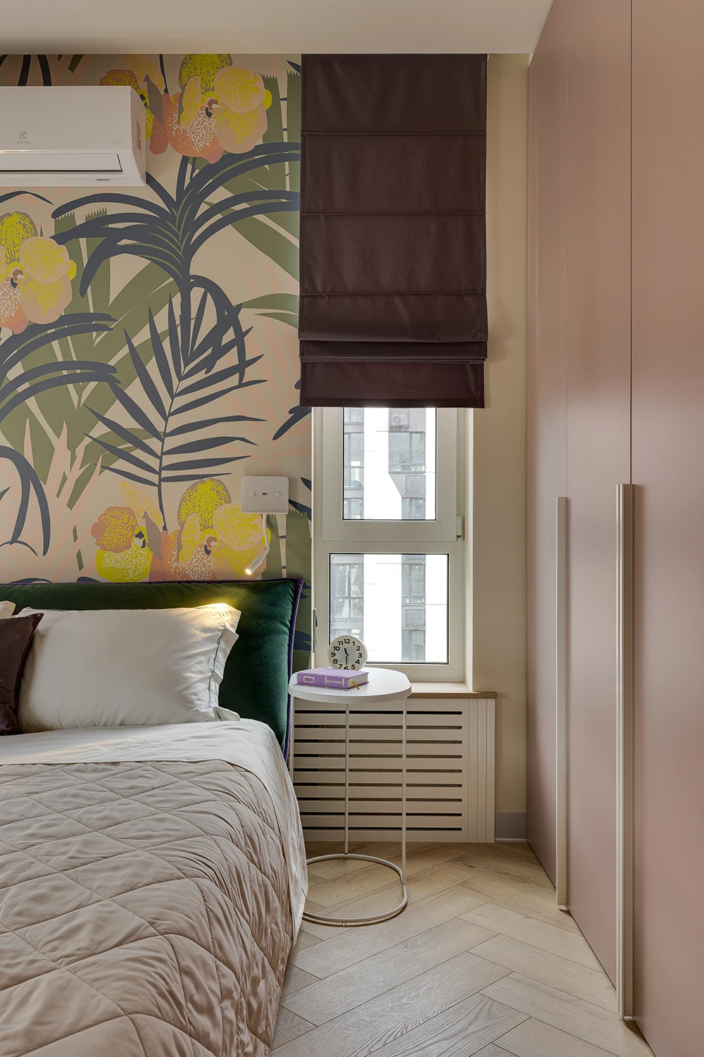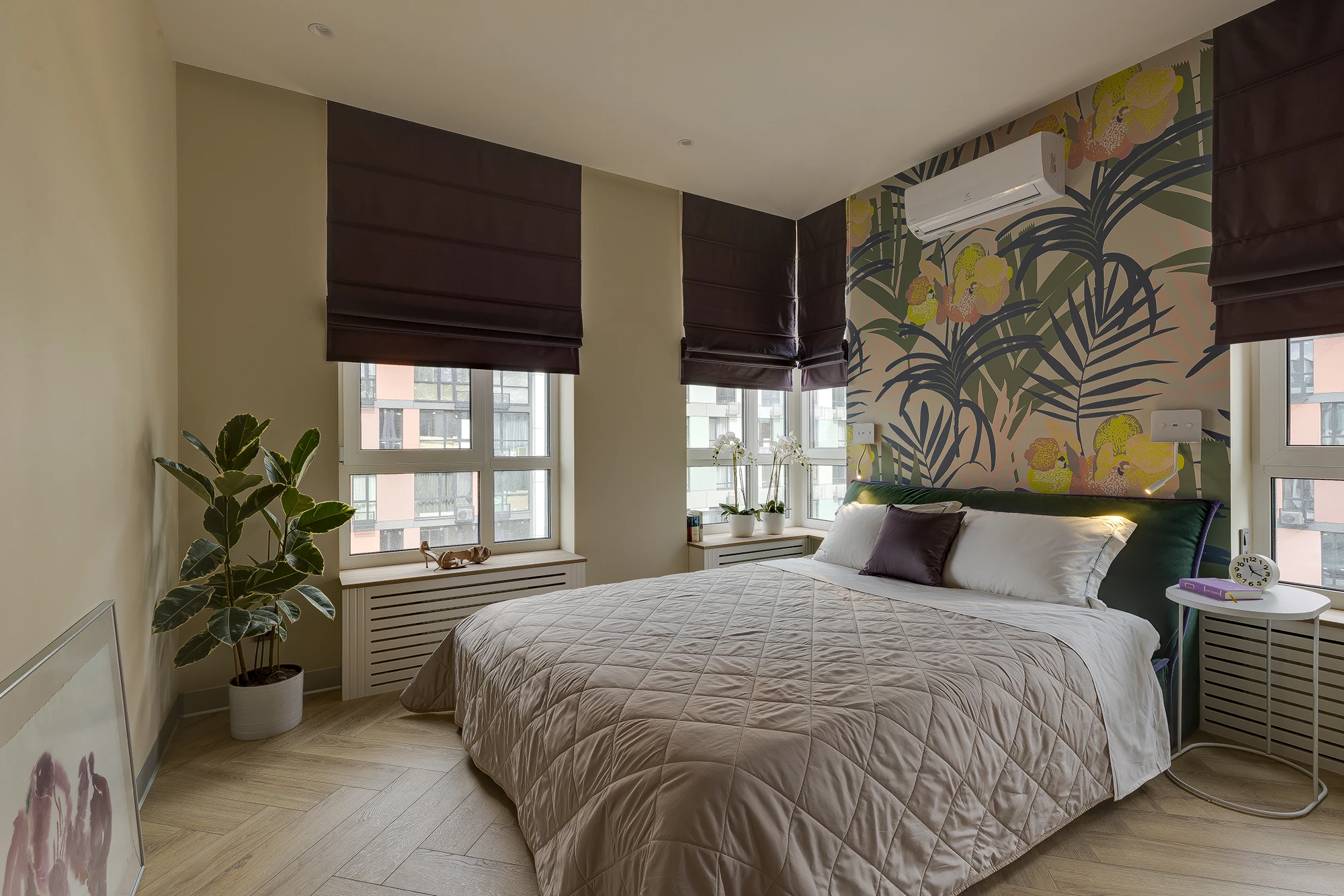 Головний акцент інтер’єру – тропічні шпалери у зоні кухні-вітальні. Вони створюють сонячну, радісну атмосферу, надаючи простору екзотичного шарму. Зелені акценти та теплі тони довкола доповнюють інтер’єр природністю та гармонією.