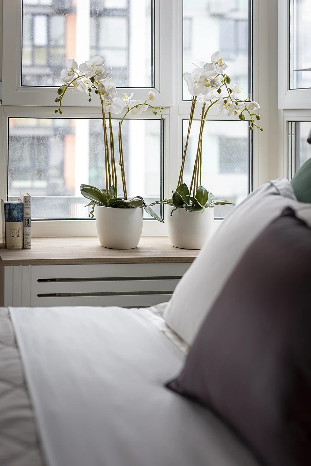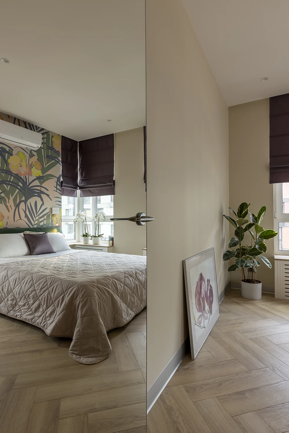Спальня вражає функціональністю: підйомний механізм ліжка створює додаткове місце для зберігання речей. Завдяки дизайнерським рішенням простір квартири використано максимально ефективно.