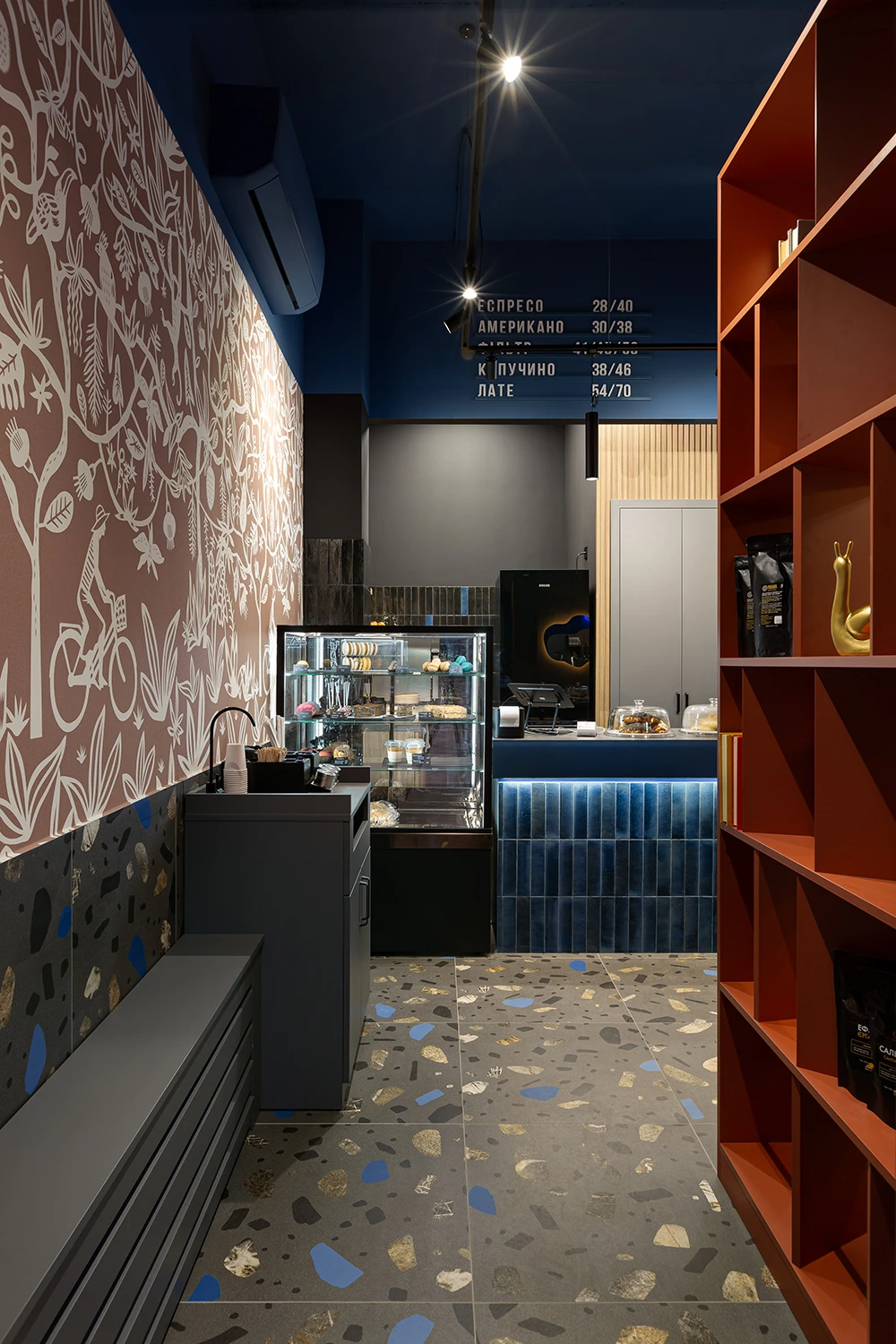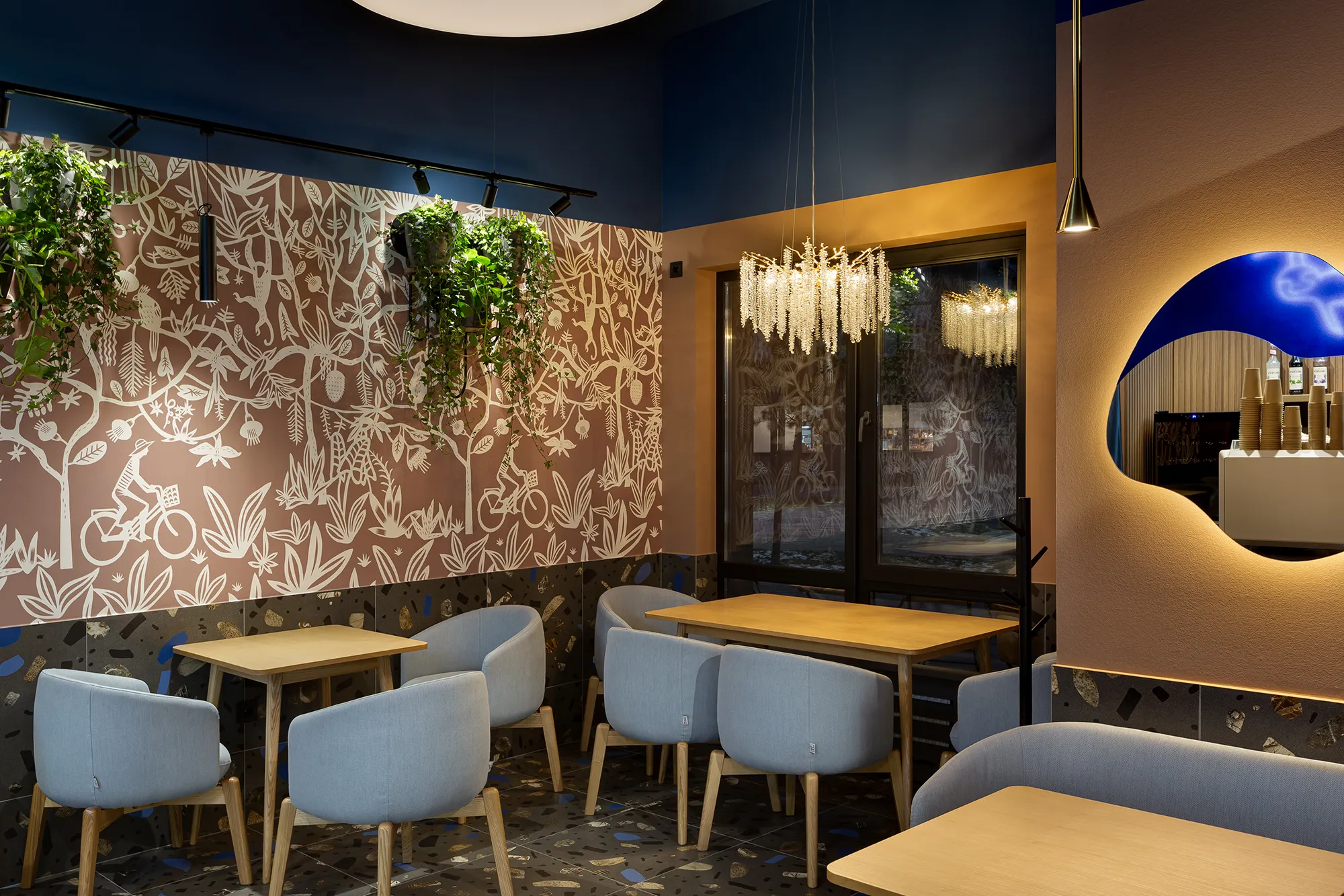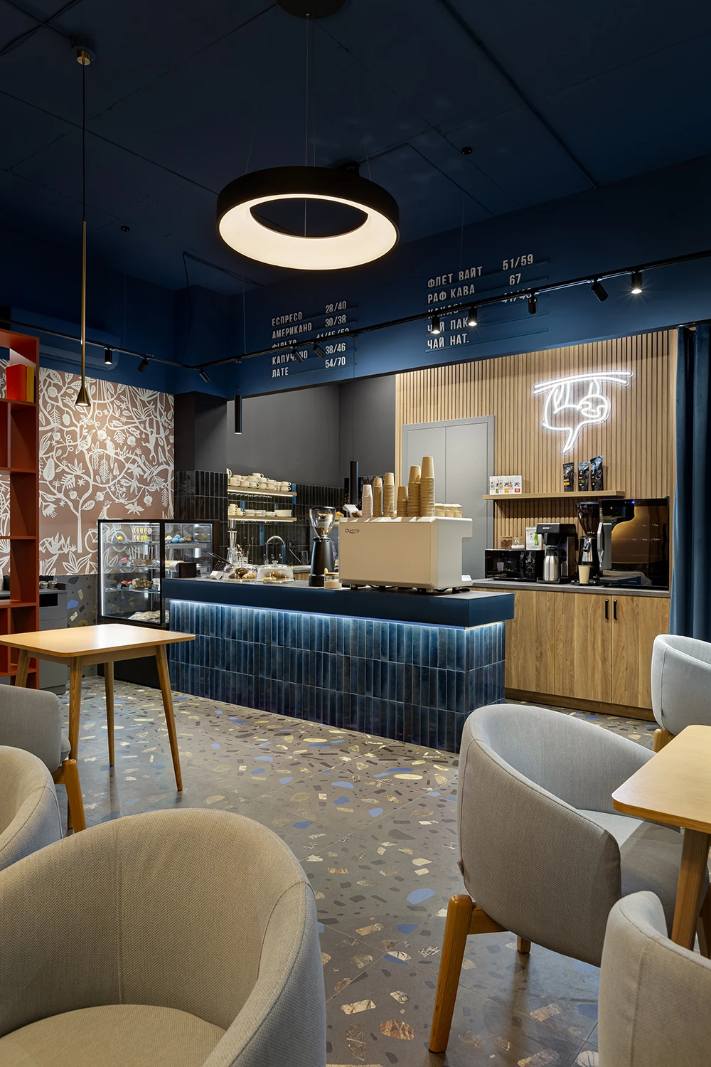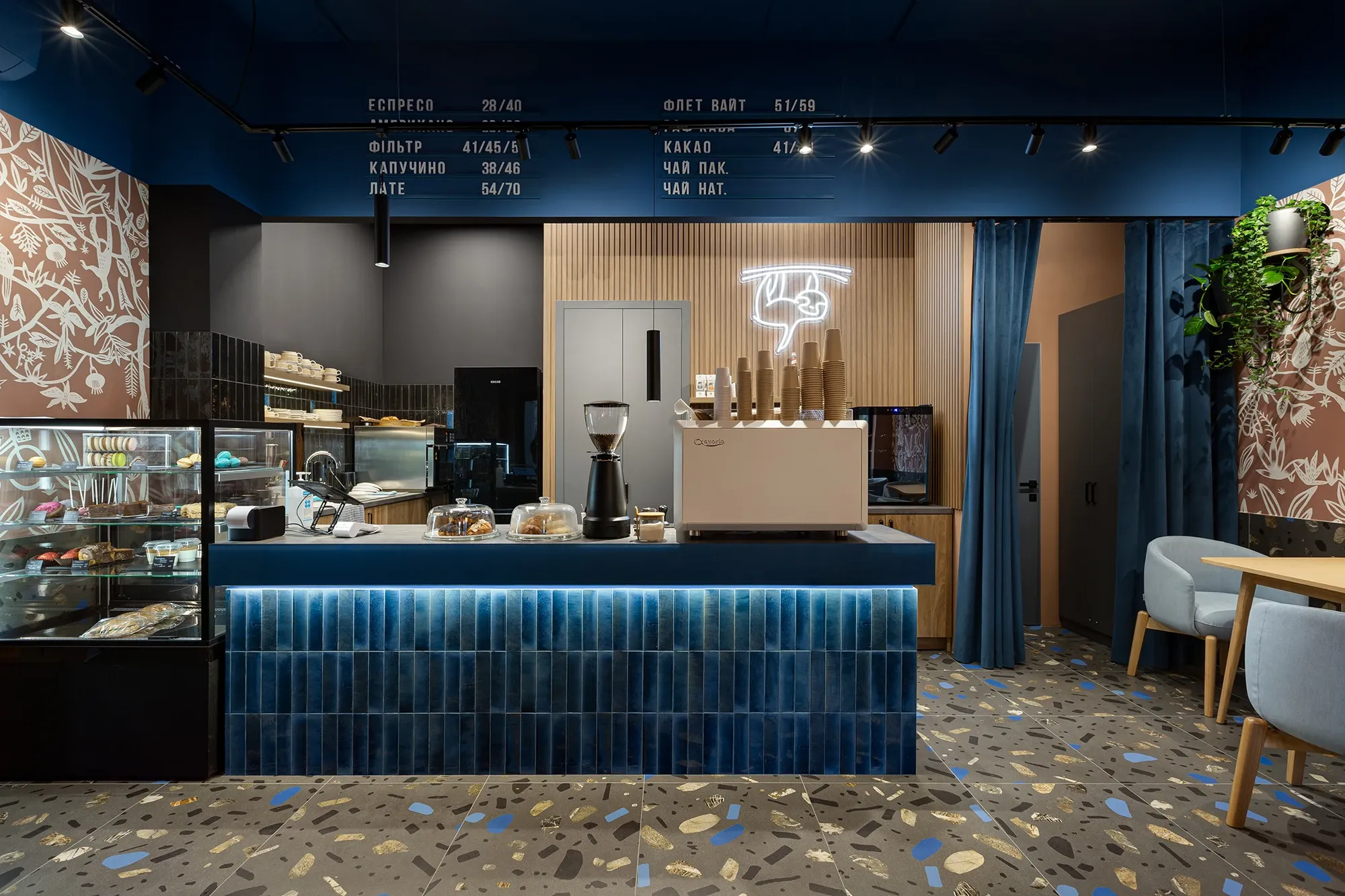 Yakava Paradise — це більше, ніж просто кав’ярня. Це ретельно продуманий комерційний інтер’єр, де сміливі дизайнерські рішення формують унікальну атмосферу. Ми відійшли від традиційної «кавової» палітри та зробили ставку на виразні кольори та сюжет закладу. Глибокий синій у поєднанні з теплими теракотовими акцентами створює гармонійний контраст, наповнюючи простір енергією та характером.