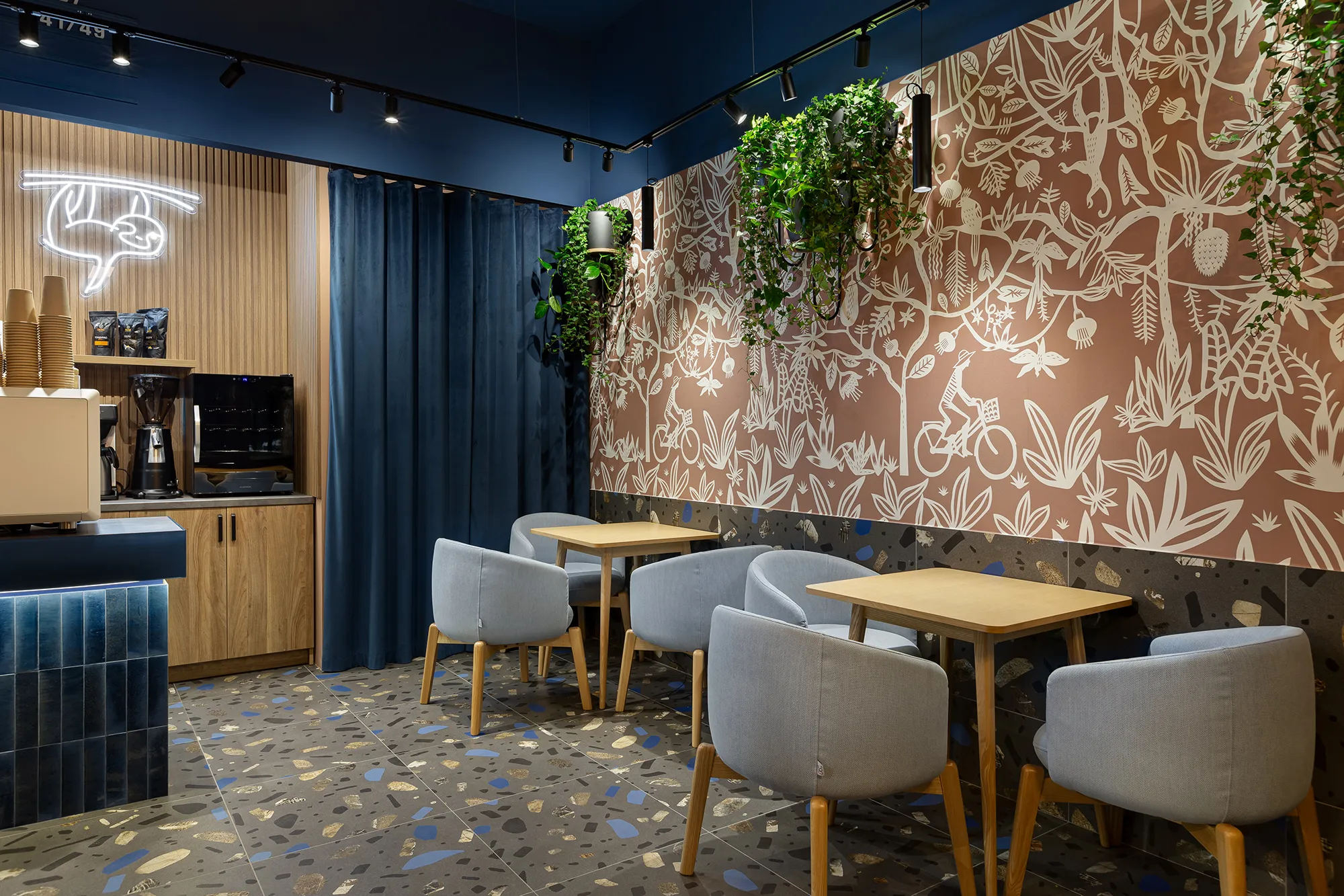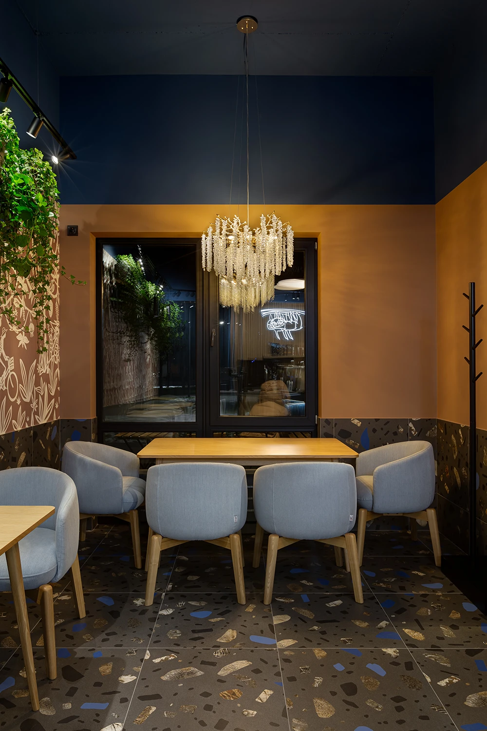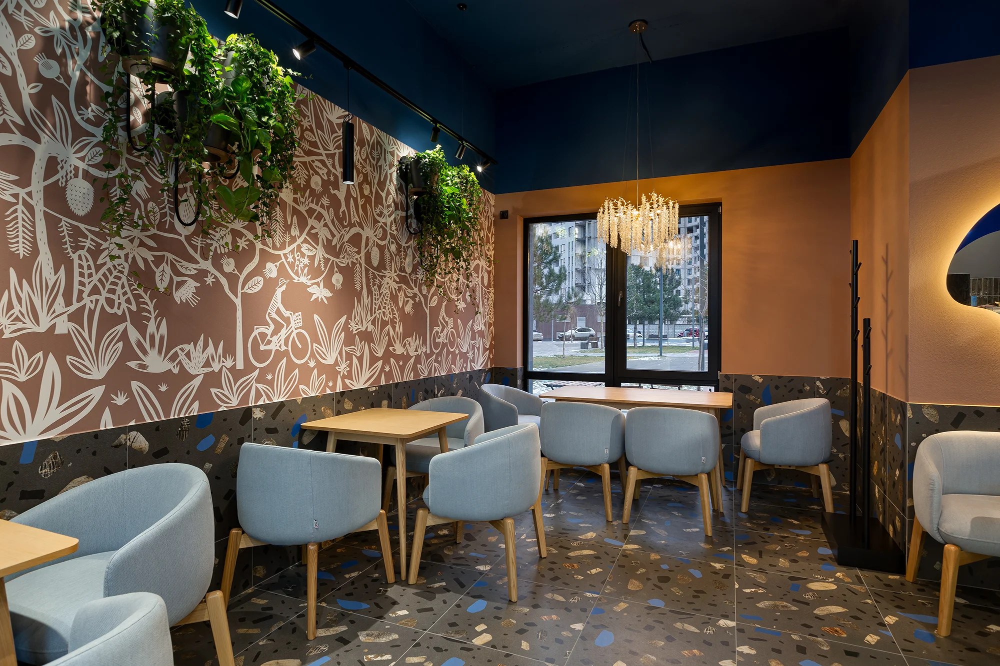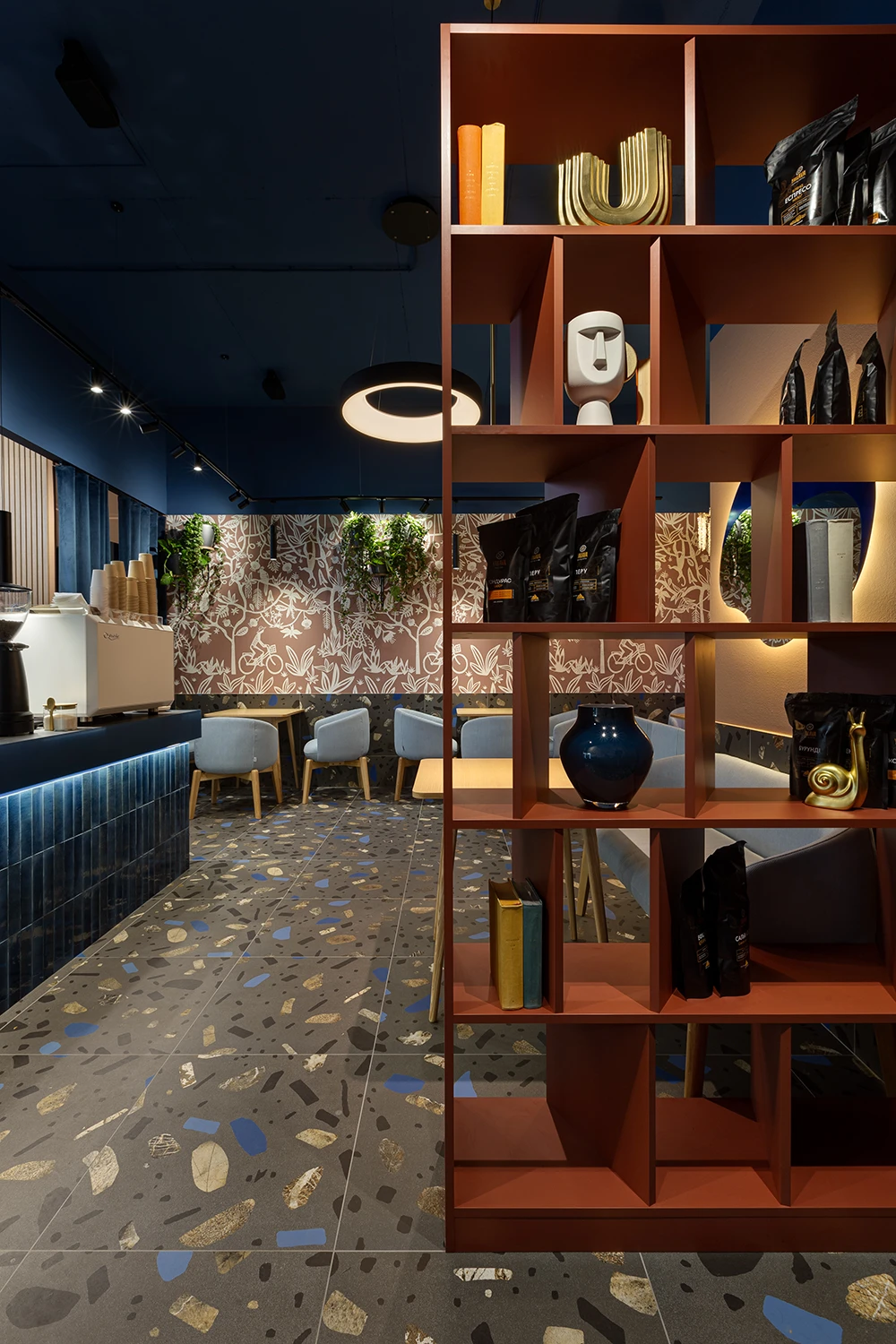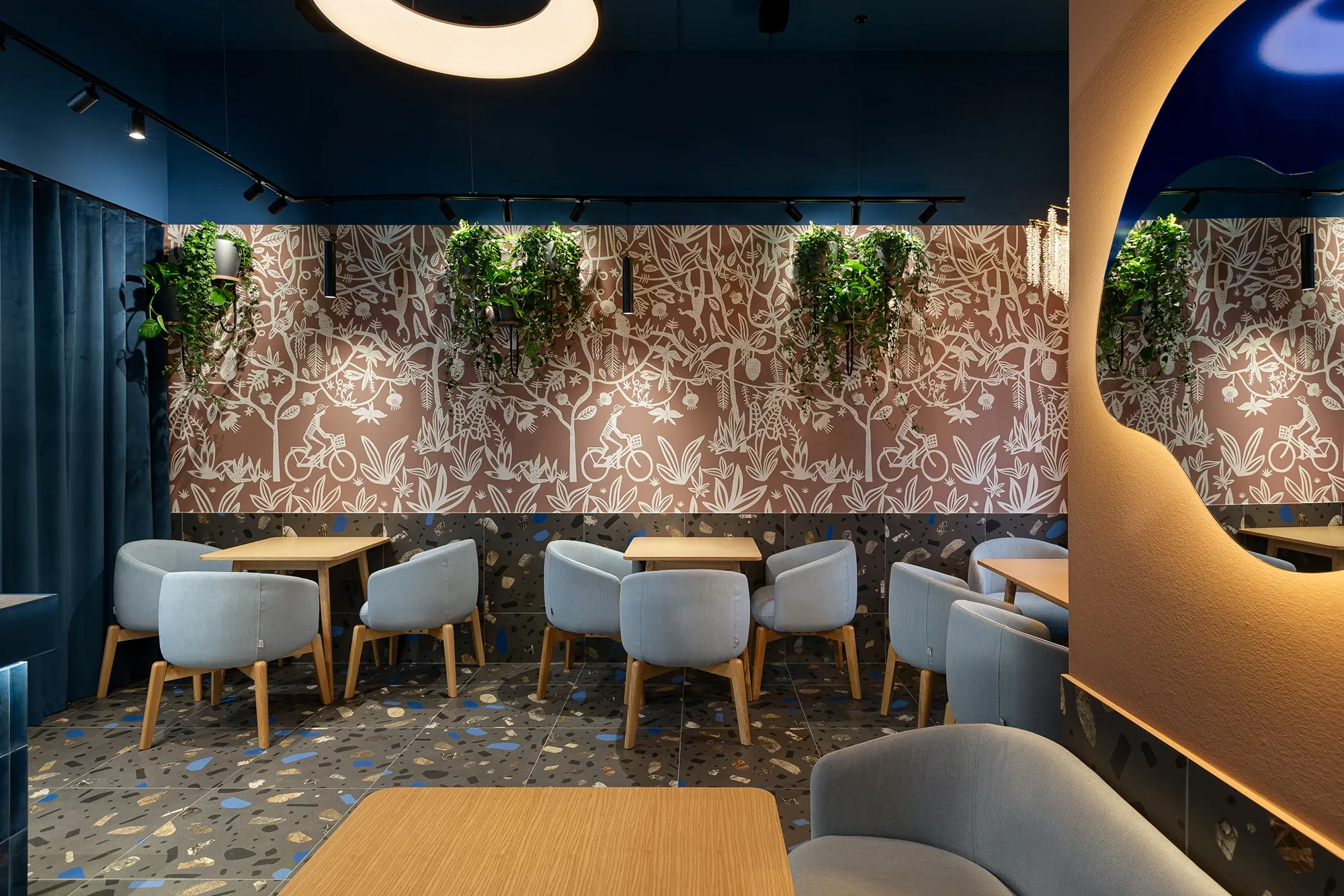 Yakava Paradise — це більше, ніж просто кав’ярня. Це ретельно продуманий комерційний інтер’єр, де сміливі дизайнерські рішення формують унікальну атмосферу. Ми відійшли від традиційної «кавової» палітри та зробили ставку на виразні кольори та сюжет закладу. Глибокий синій у поєднанні з теплими теракотовими акцентами створює гармонійний контраст, наповнюючи простір енергією та характером.