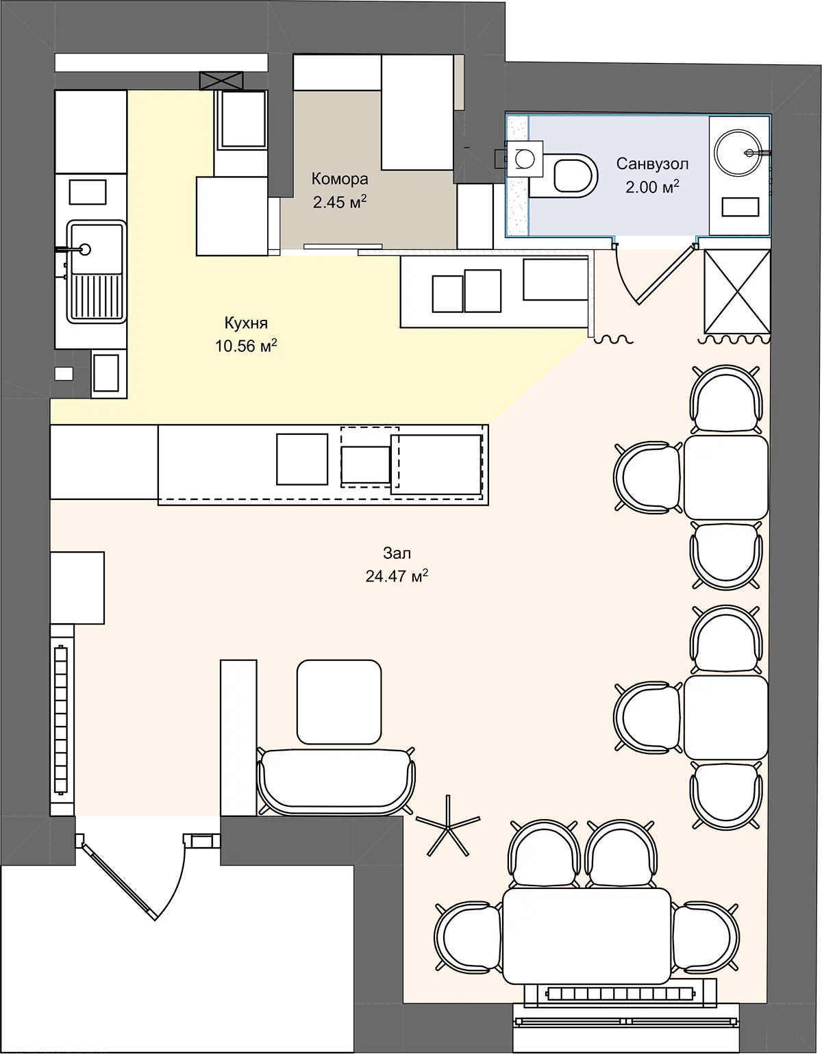 У цьому проєкті важлива кожна деталь. Динамічне планування дозволяє простору залишатися комфортним у будь-який час доби: вранці тут затишно пити каву, вдень зручно працювати або зустрічатися з друзями, а ввечері інтер’єр набуває особливого шарму завдяки м’якому освітленню.