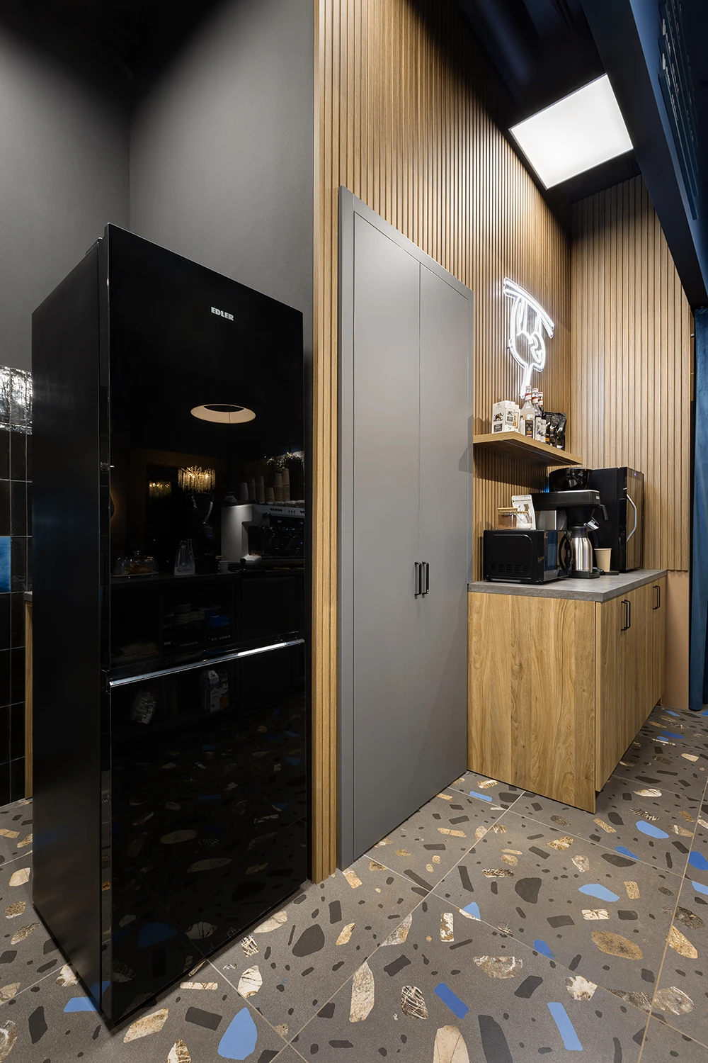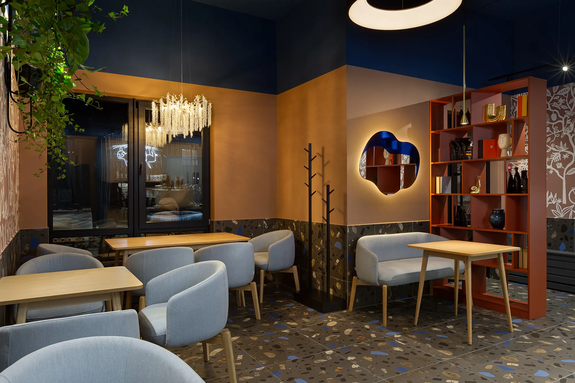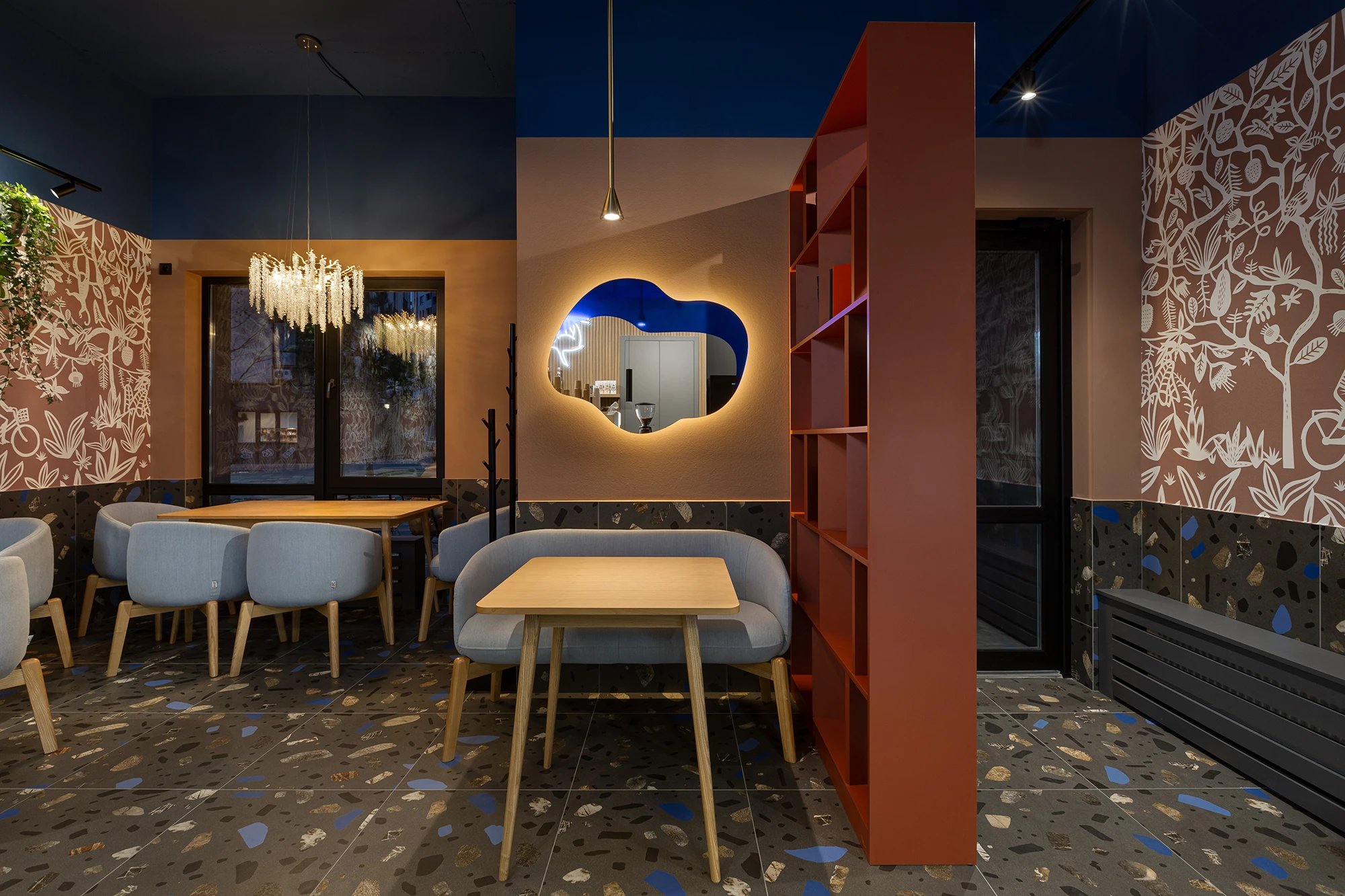 Окрему увагу приділено матеріалам. Ми використали террацо з яскравими синіми вкрапленнями, натуральне дерево та глянцеву глазуровану плитку, що робить барну стійку центральним акцентом простору. Яскравий стелаж на вході відокремлює відвідувачів, що вже відпочивають, від тих, хто щойно зайшов. Так само працює штора, що відокремлює вхід у санвузол від основного залу. Ергономічні м’які меблі, ретельно продумане освітлення та функціональність кухні відповідають усім вимогам сучасного комерційного інтер’єру.