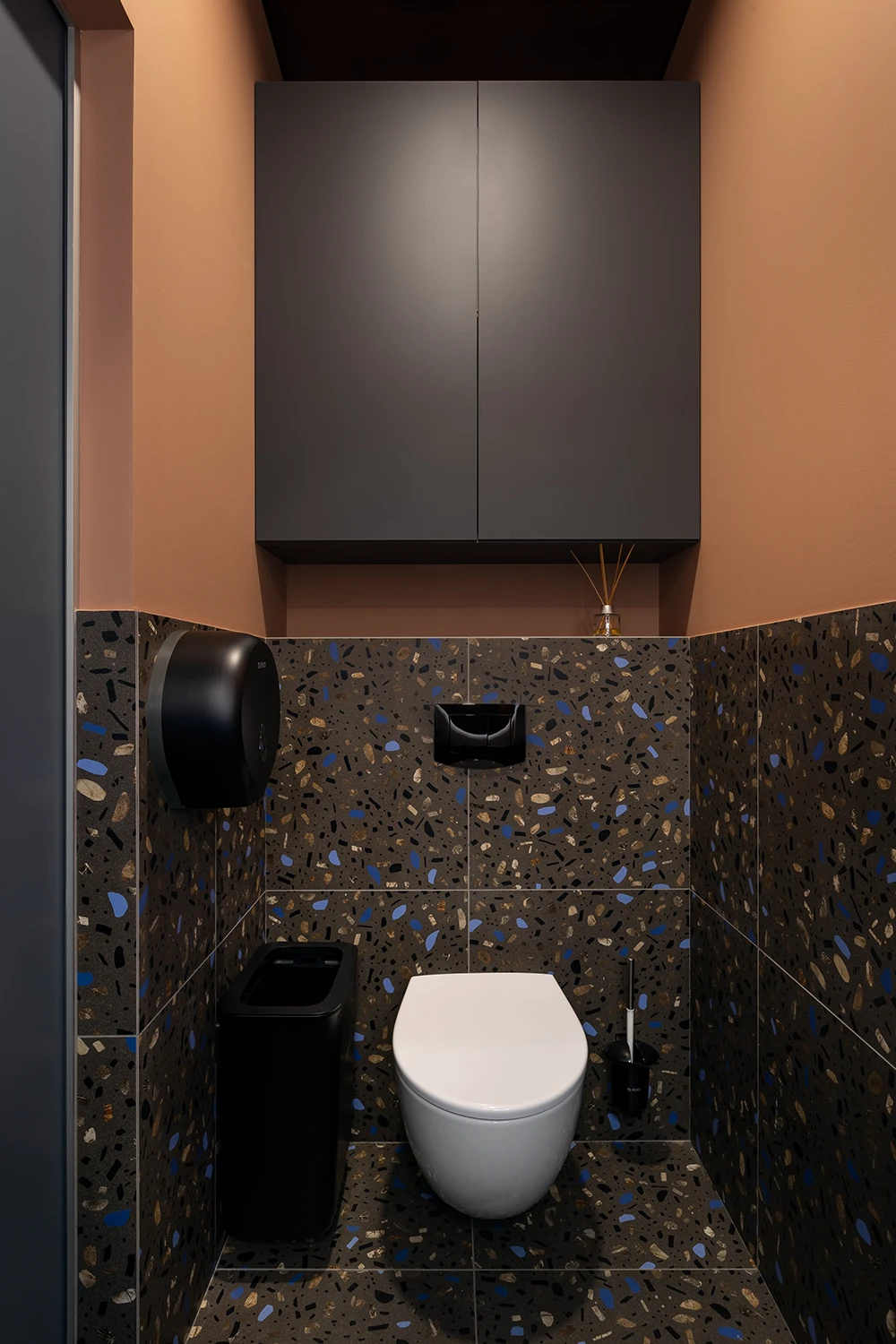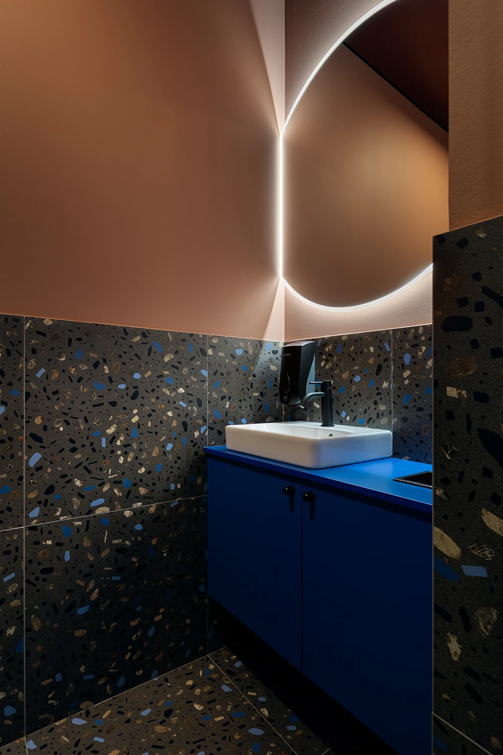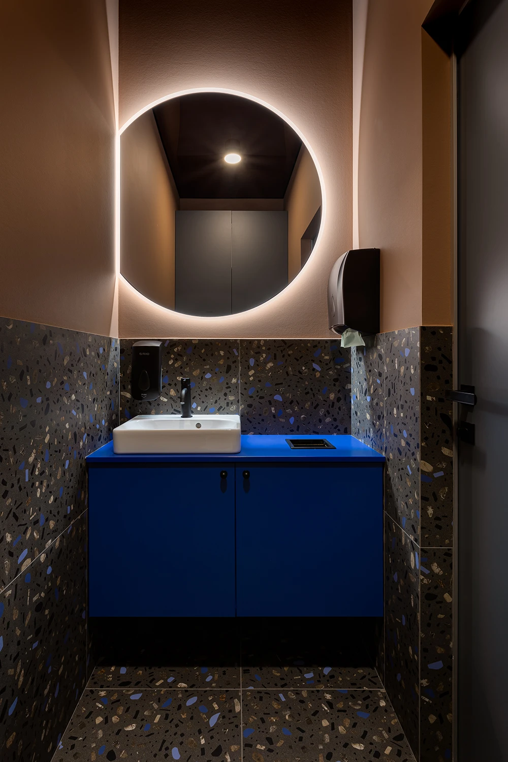 Окрему увагу приділено матеріалам. Ми використали террацо з яскравими синіми вкрапленнями, натуральне дерево та глянцеву глазуровану плитку, що робить барну стійку центральним акцентом простору. Яскравий стелаж на вході відокремлює відвідувачів, що вже відпочивають, від тих, хто щойно зайшов. Так само працює штора, що відокремлює вхід у санвузол від основного залу. Ергономічні м’які меблі, ретельно продумане освітлення та функціональність кухні відповідають усім вимогам сучасного комерційного інтер’єру.
